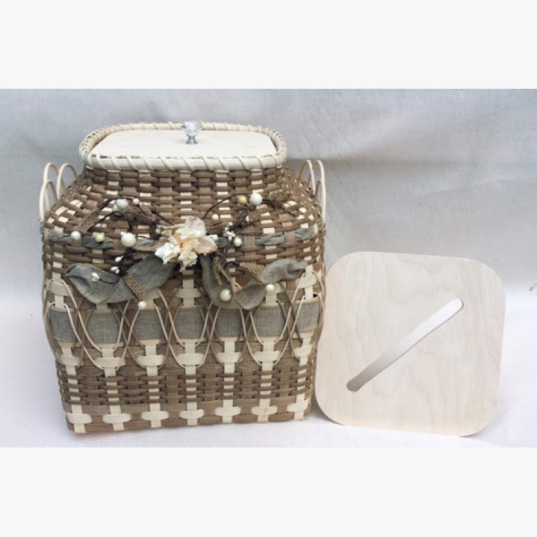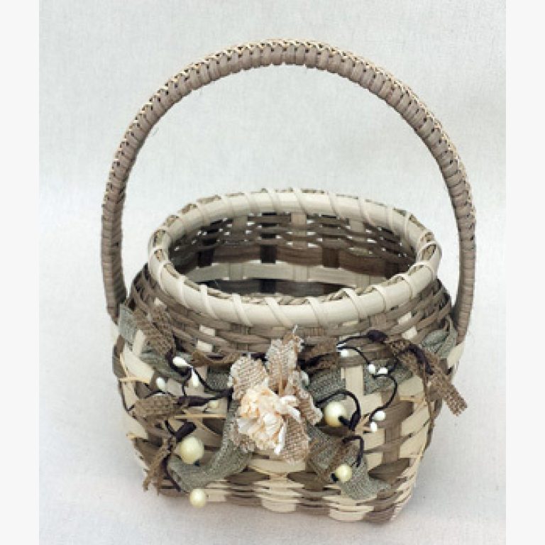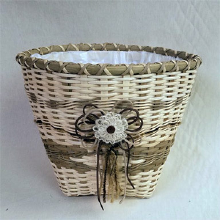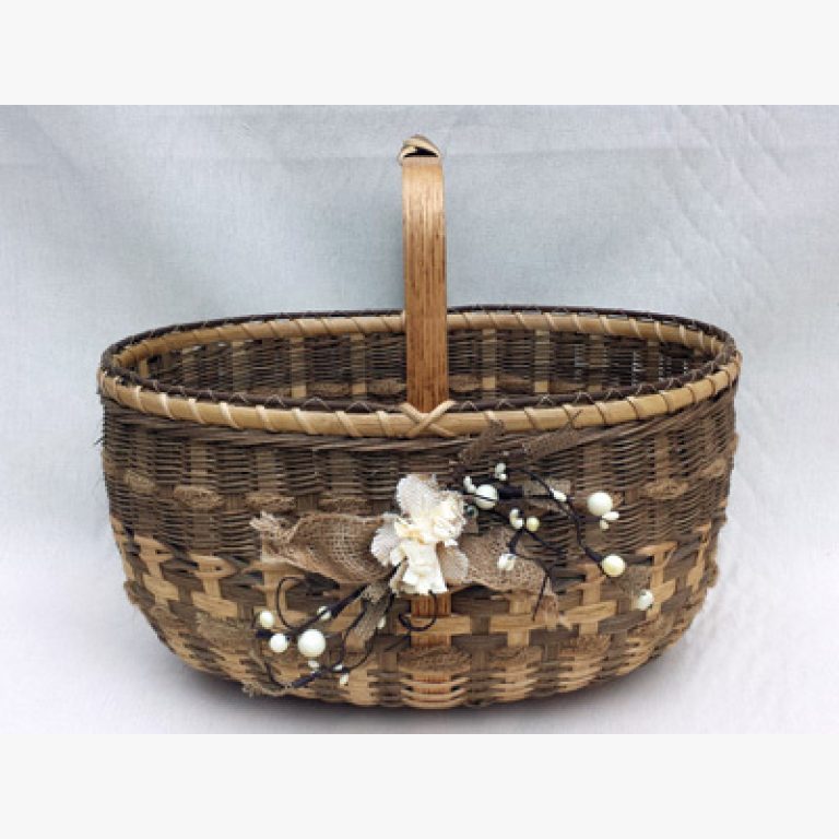 This beautiful Long John style basket features a simple continuous twill using smoked and natural reed. It has a woven round base with twining and a double X’d laced rim with leather handle.
