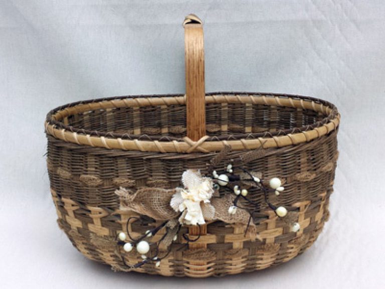 This beautiful basket begins with a 12" x 12" square rim as your handle inserted into an 8" x 12" oval wooden base. Techniques are start/stop weaving, twisting rows of burlap, arrows, twining, 4-rod wale, a separately laced rim filler and the interlocking knot in the center of the handle. Embellishment is burlap streamers, flower and a spray of white berries with burlap. All reed is natural and smoked.