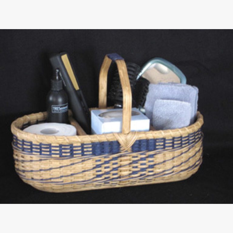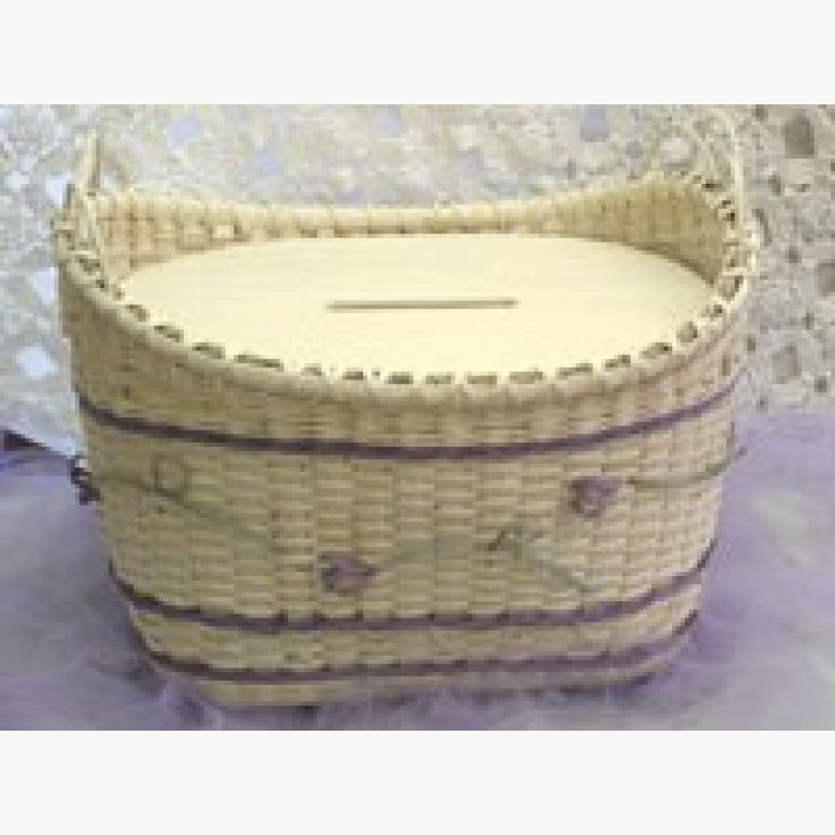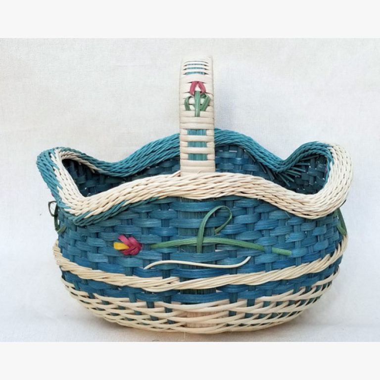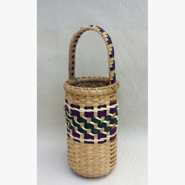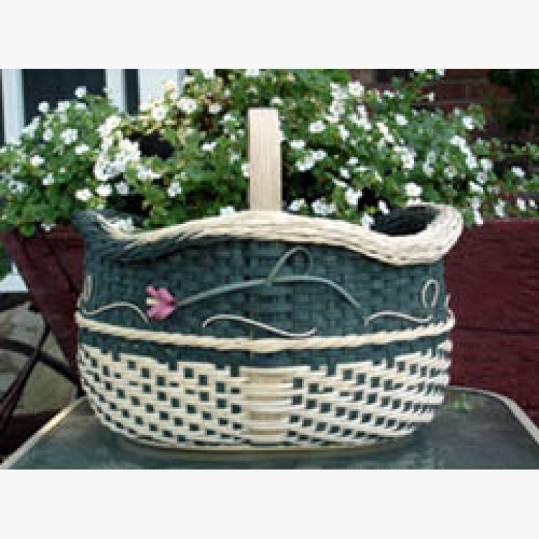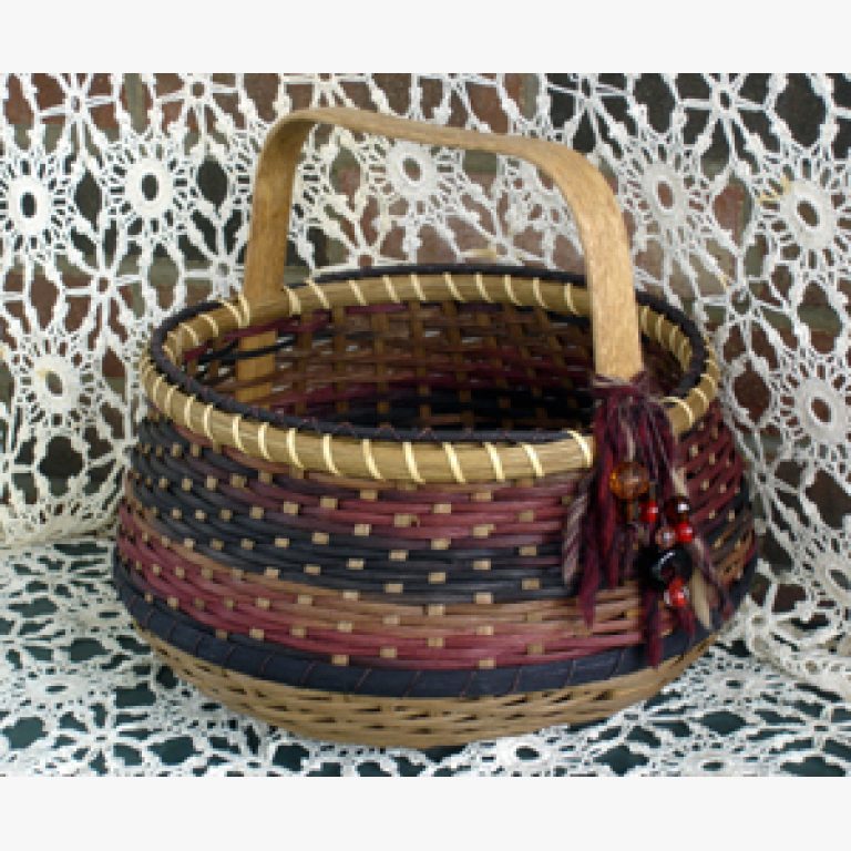 This little beauty is woven in all smoked and natural reed. You will learn to wrap the Williamsburg handle with decorative X’s in chair caning then continue with a woven base, twining, cross-stitching and twisted burlap. Learn to disengage your basket from the handle during the last third of your weaving. Embellish with burlap spray and white berries. Makes a great flower girl basket.
