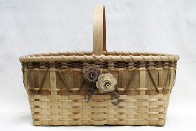 This large Market Basket is woven for that authentic "Old Time" look for a trip to the market. It features natural and smoked reed and a burlap weaver over top a 2" maple strip. It is adorned with two burlap roses and twisted hemp for an embellishment which is included in kit.