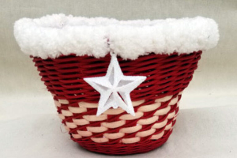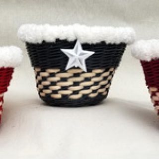 Adorable Christmas basket for candy, cookies or snacks. Begin with a 3-1/2" round wooden base and learn to triple twine using double spokes to hide your ends. Twine up the sides with flat oval reed and colored RR and then end with more colored triple twining. The basket has no rim but is looped with chenille to create this fun fluffy rim. Adorable with a sparkly star embellishment. Available in red, hunter or burgundy.