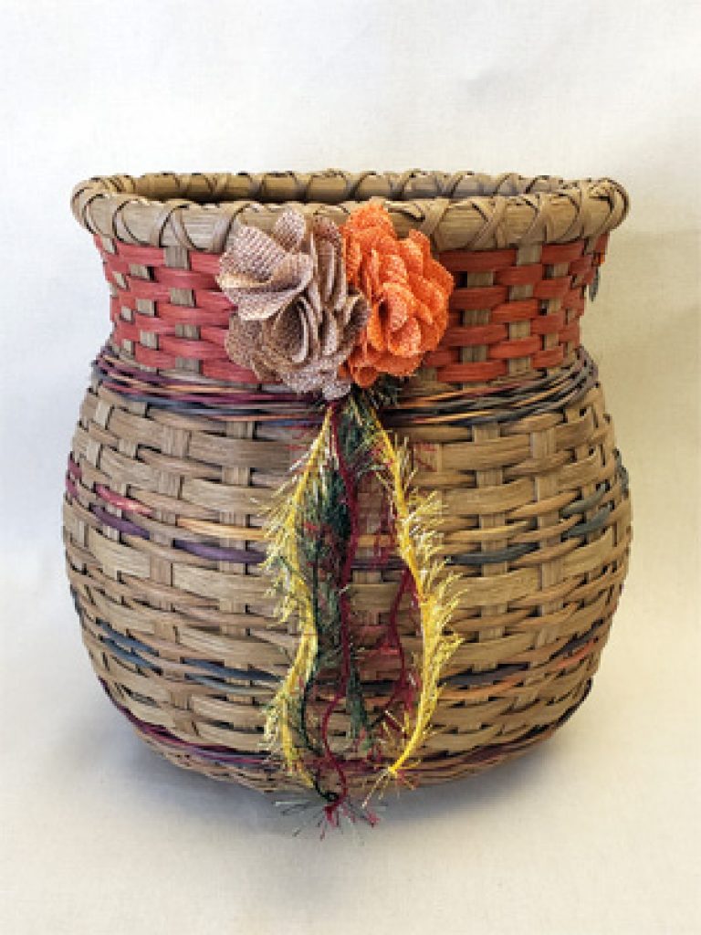 Begin with a 4" x 7-1/4" oval wooden slotted base. All spokes are smoked with smoked, autumn space dyed and orange weavers. The majority of the weaving is traditional start/stop with some triple twining in autumn space dyed round reed. Embellished with burlap flowers and matching yarn streamers which are included with the kit. Pattern gives 5 major shaping tips and circumference measurements to enable you to weave and shape this beautiful design.