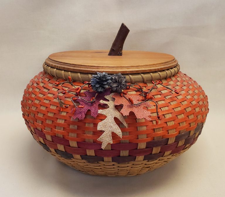 This, easy to weave large, gorgeous basket cries out with Autumn colors. It uses smoked and pumpkin reed with a beautiful autumn spaced dyed reed accented in the center. It begins with a 9" round wooden base and flares out and then back in to achieve this pumpkin like shape. Embellished with 3 burlap leaves, pip berries and pine cones all included in kit. The lid with stem is sold separately. This pattern is written for the beginner weaver and has 15 color photos and explicit directions.