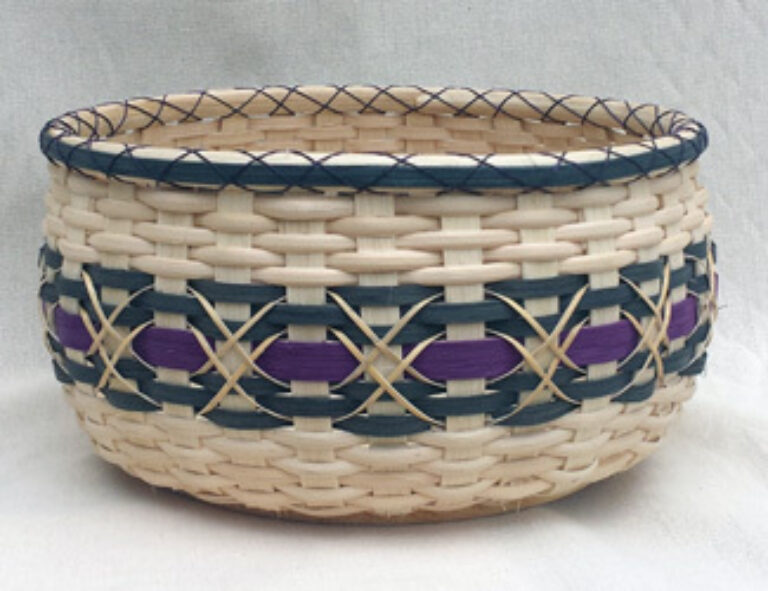 Begin with a round 7-1/2" wooden base for this elegant snack basket with my decorative "infinity" chair caned overlays. The majority of the basket is start/stop weaving. Shaping is emphasized in the pattern and you will do the Triple X rim lacer in matching waxed linen.