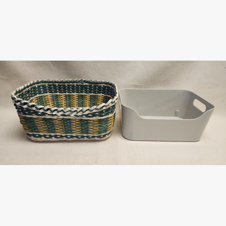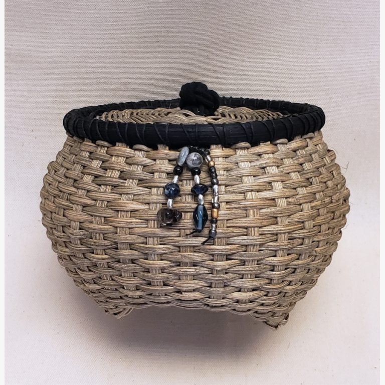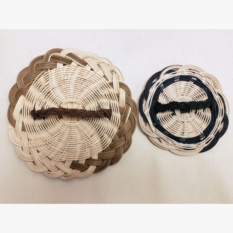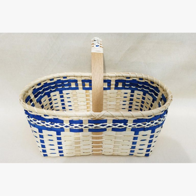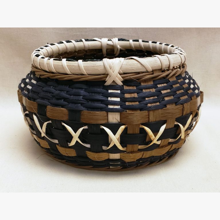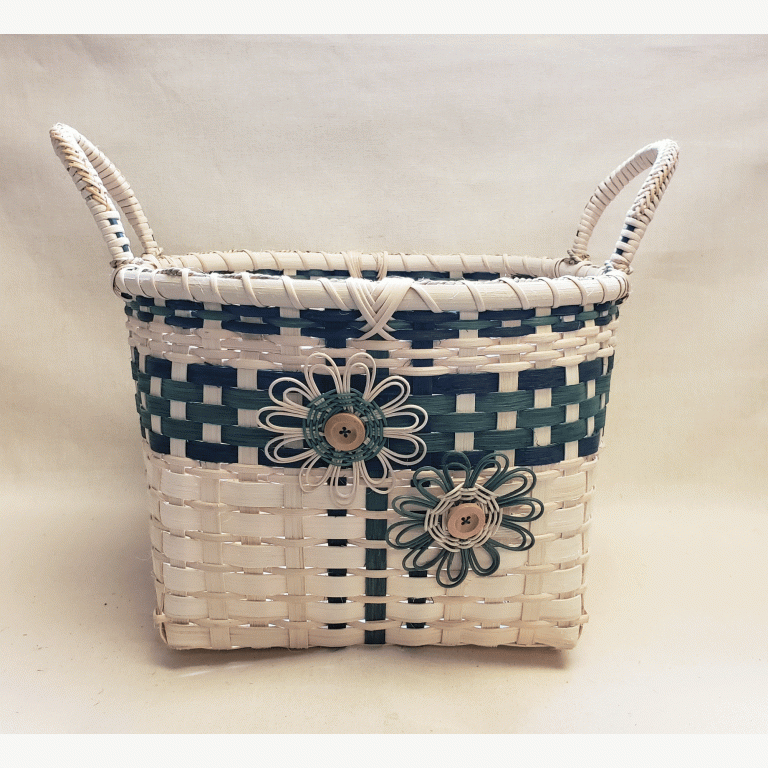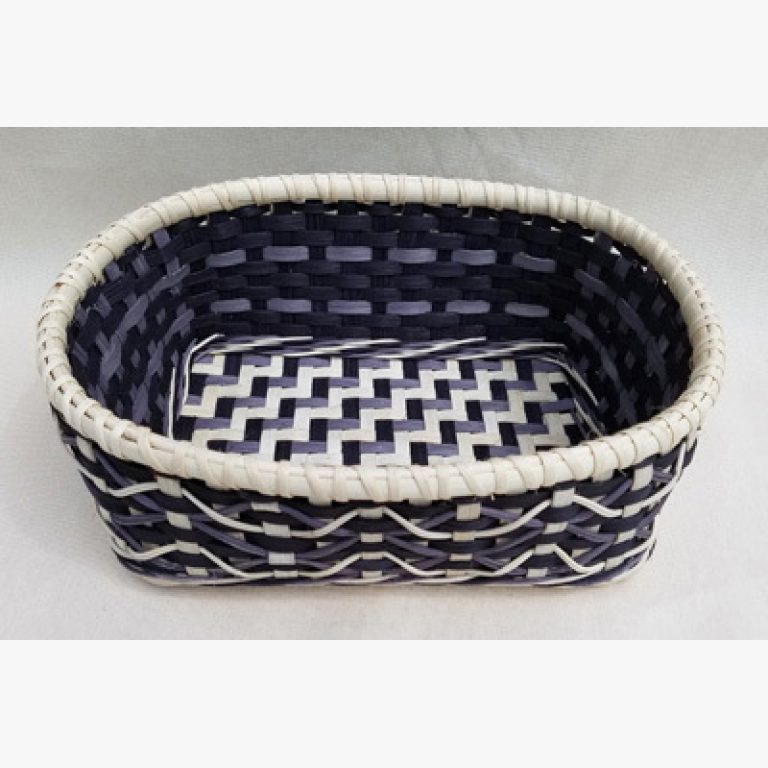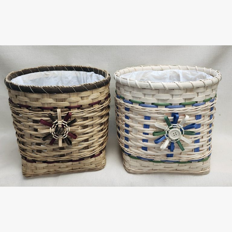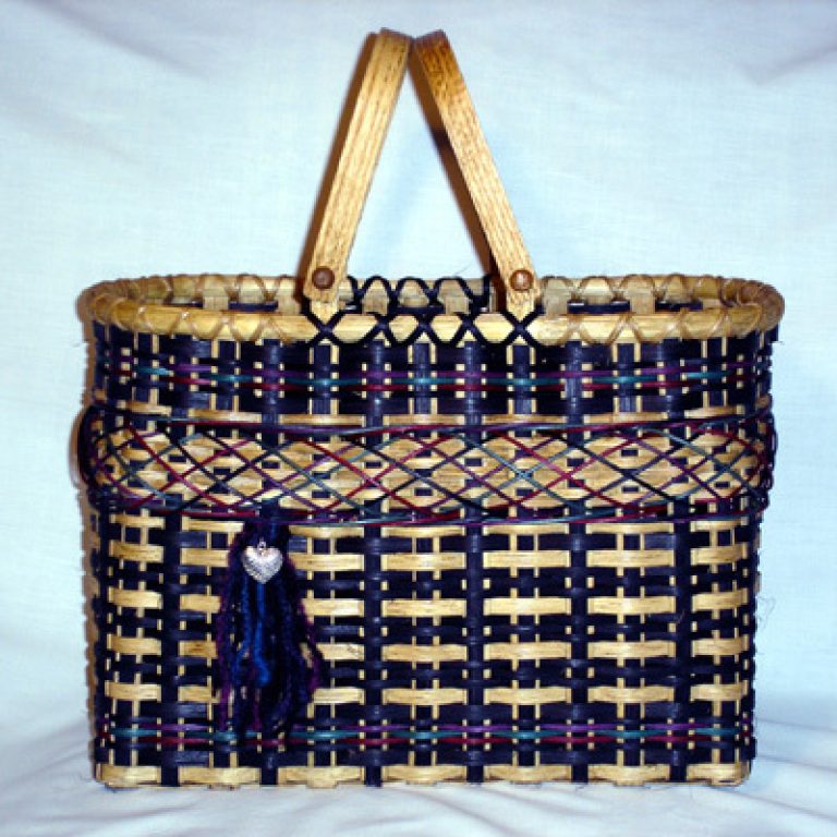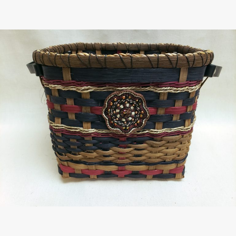 This timeless Wine/2-liter pop carrier is accented with thin chair caning. The majority of the basket is start/stop weaving with a woven divider down the center to keep the bottles from touching. Learn this Infinity cross over center design overlaying the purple and hunter reed, the caned cross over handle and caned rim with godseyes at each handle.