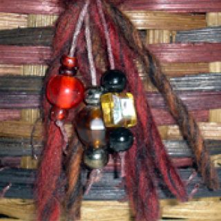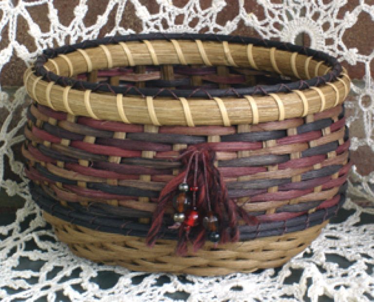 Learn to twine a round base with 1/4" flat oval smoked spokes. The rich coloring is my unique mahogany space dying reed with a continuous smoked twill at the base and spaced dyed twill on top. Learn to ti-twine the black round reed black accent reed with burgundy waxed linen. Also learn to lace a black round reed filler above a traditional rim. It is embellished with matching yarn and beads which are included in kit. This basket is a great lesson in shaping.