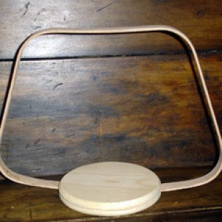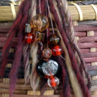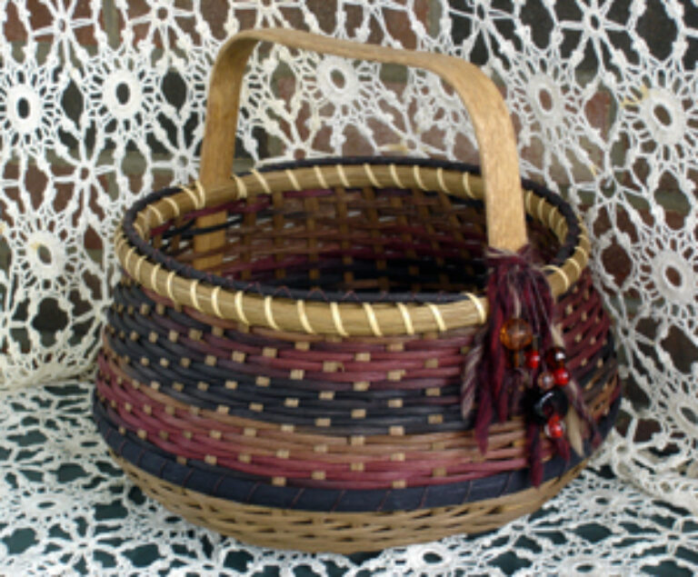 This basket begins with a 5-1/2" round base with an 8"x 8" square handle flared out and attached in the slot. The rich coloring is a my unique mahognay space dyed reed accented with all smoked reed. You will twill continuously at the base with smoked, ti-twine a fake rim with 1/2" FO black and twill with spaced dyed on top. Also learn to lace a black round reed filler above a traditional rim. It is embellished with matching yarn and beads which are included in kit.