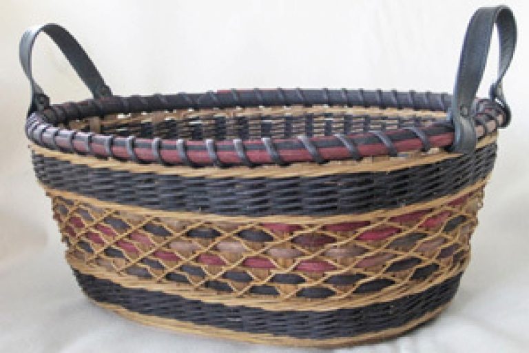 Mahogany space dyed reed is featured in this black, smoked and burgundy striking basket. Begin with a 6" x 10" race track slotted base with triple twining, 4-rod wale and continuous cross stitching techniques explained. A very sturdy, very impressive basket!