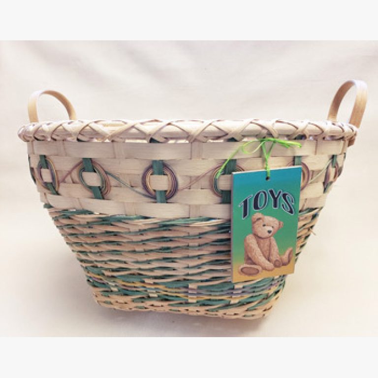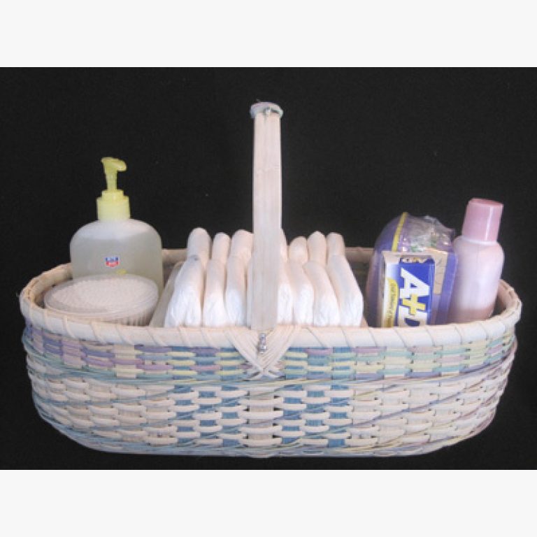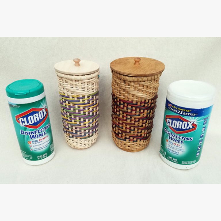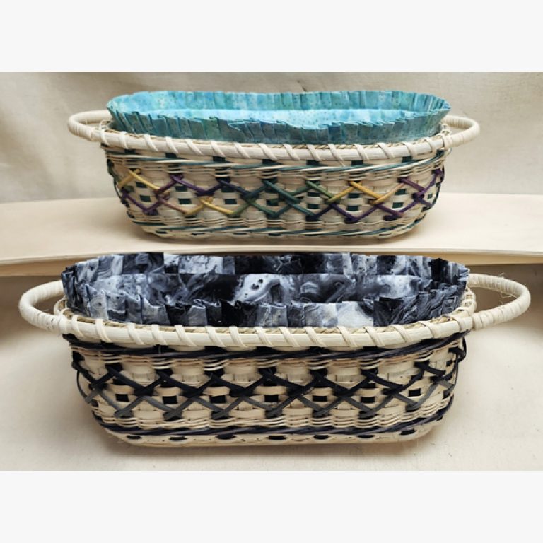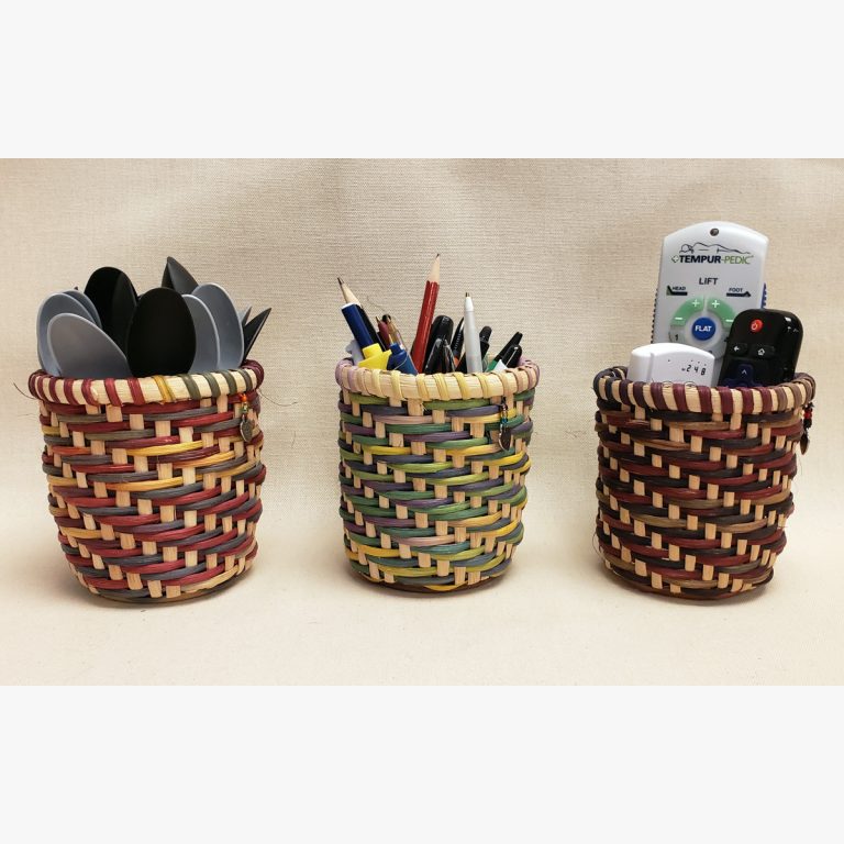 This versatile wastebasket begins with a 5" x 8" Corner Round wooden slotted base. Techniques are continuous twill, triple twining in pairs and overlay vertical color to set off the beauty of the center twill and insert decorative loops.