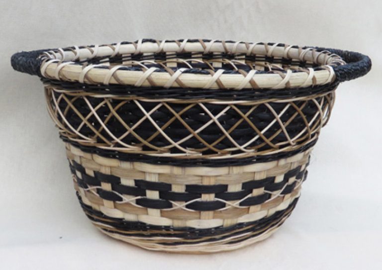 This striking black, smoked and natural basket has unique handles formed from the outside rim and then wrapped in black seagrass. Learn triple twining changing from all natural to all black in a beautiful triple twined spiral, cross stitching and french randing. Shaping is emphasized in this pattern for a gradual growth the entire basket beginning with a 9” round slotted base. Practical and beautiful!