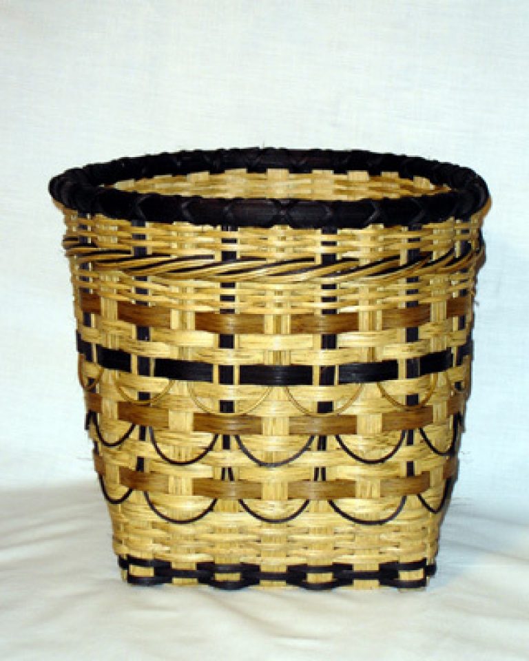 A practical wastebasket for my smoky line of baskets. It begins with a woven filled base and features start/stop weaving with inserted loops in black and smoked round reed. There is 2-2 twining using natural, smoked and black round reed. End with this striking all black rim, filler and lacer.