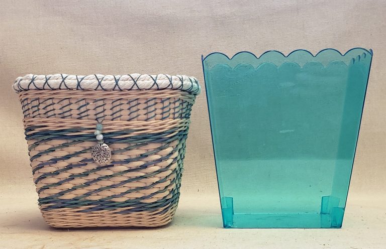 Use this mold to form this adorable "Beachy" basket.  Begin with a rectangular wooden base.  Techniques learned are triple twining beginning with all natural and ending with all Spring Space Dyed reed.  The center is triple twined with round reed and flat oval reed.  The top is Ti-Twined using teal waxed linen.  End with an outside rim and filler using 3-ply soft roping and embellish with thiis sand dollar charm with beads.  Too cute!