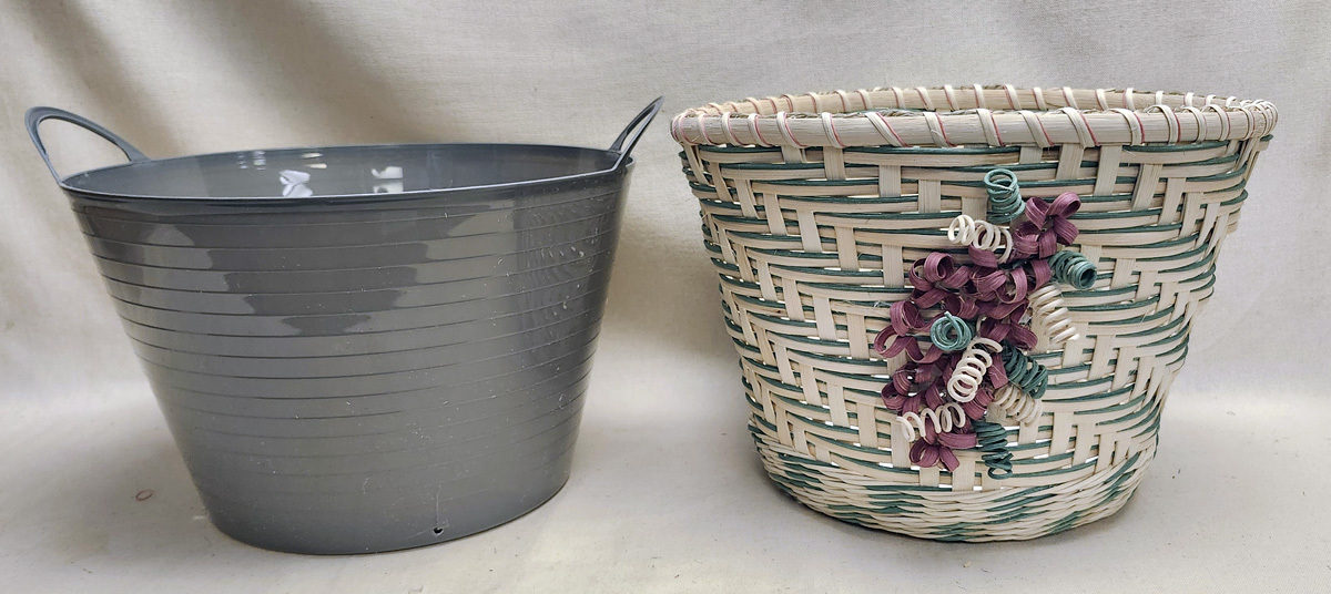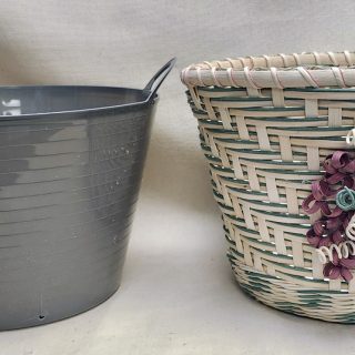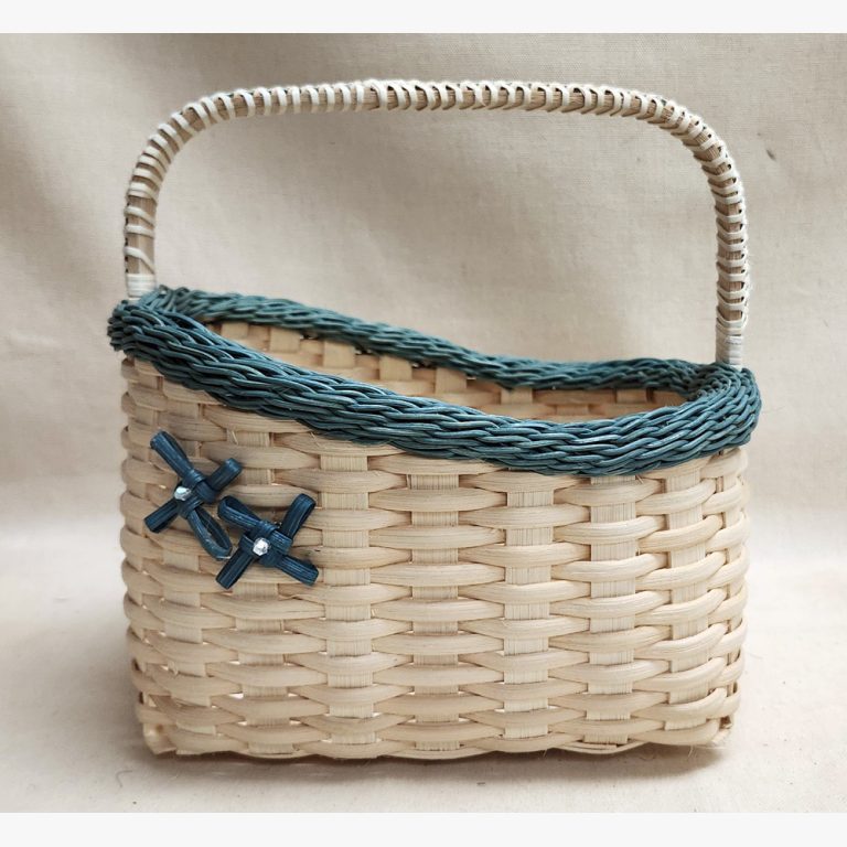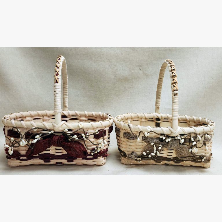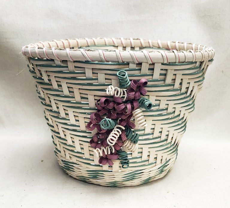 Begin with a 7-5/8" round wooden base and mold (included in kit) Io guild your shape. Learn this checkerboard 4-rod wale and then 3-3 twill using flat oval natural with Spearmint RR. It has a tradition rim shadowing lacer with mauve waxed linen. Create these beautiful flowers and curls by wrapping the mauve around a dowel rod and the curls around a pencil. Hot glue your fancy flowers in any design you like. A creative beauty!
