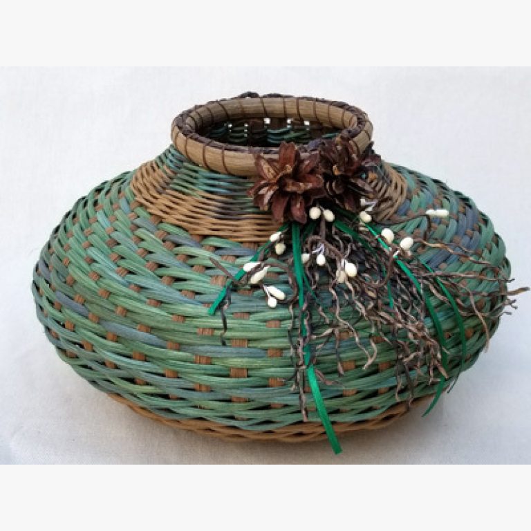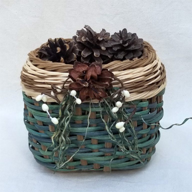 Create this cathead base and then twill with my Evergreen Space Dyed Reed to achieve this outdoor evergreen appearance. The base is an open weave with half natural and half smoked spokes. After the twill you will be using natural and smoked reed for three and four rod wale. Shaping is emphasized to end with your spoke tucked rim. Embellish with a burgundy, burnt orange and natural burlap oak leaf along with curly green wire, raffia and a pine cone which are all included with the kit.