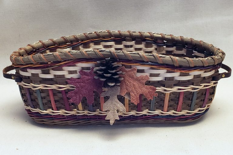 This striking basket is as practical as it is beautiful. Begin with an oval wooden base, smoked spokes overlaid with autumn space dyed reed. Learn triple twining, arrows, adding side leather handles and shadowing a laced rim with orange waxed linen. Embellish with burlap fall leaves and a sliced pine cone.