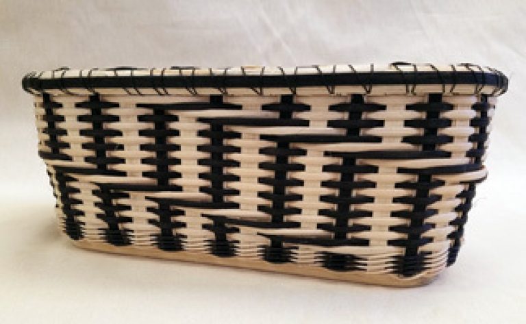 Begin with a 5" x 10-3/4" corner round rectangular wooden base and twine using natural and color, overlaying color on every other spoke. Learn to chase weave this easy twill pattern for this unique design. End with a traditional rim overlaid in color, sewed on with waxed linen using 2 colors of leather for a rim filler matching the color of the basket.