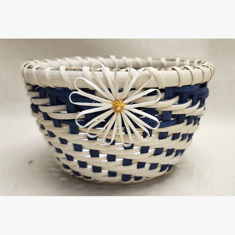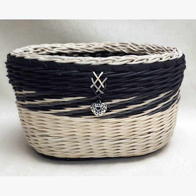This unique tote begins with a 4" x 9-3/4" Race Track wooden base. The bottom is twined using natural seagrass and the center design is woven using dyed seagrass with 5/8" reed, bordered by 4-rod wale. Learn to form these handles using Oval Oval reed wrapped in natural seagrass. This beautiful muslin liner with soft roped handles is attached with Velcro so it can easily be removed for washing. Mine is woven in Blue but below are other available colors. Burlap and beaded shell embellishment sold separately.