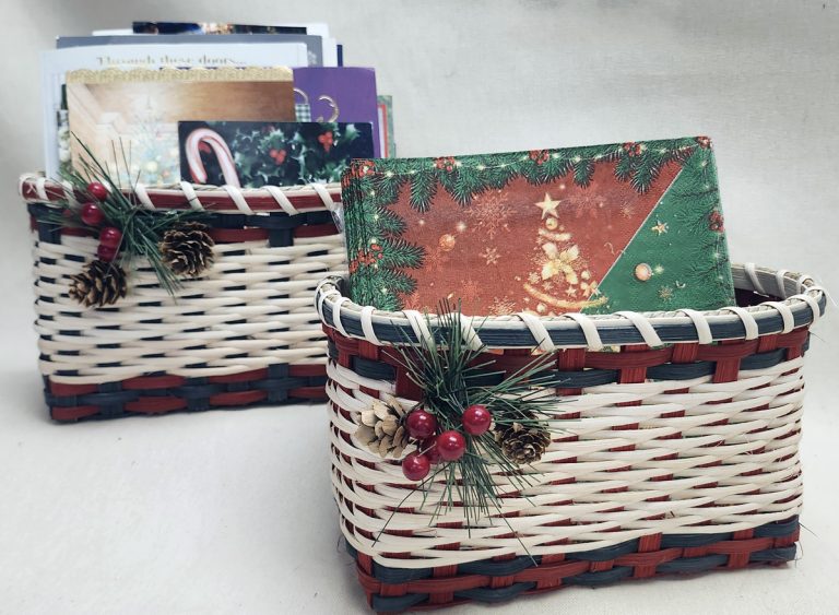 This adorable Christmas basket is so practical for napkins, Christmas cards or a beautiful holly arrangement. It has a solid woven base and the natural sides are an easy 2-1 continuous twill. The striking embellishment is included in the kit. Specify choice of either RED spokes (basket in front) or HUNTER GREEN spokes.