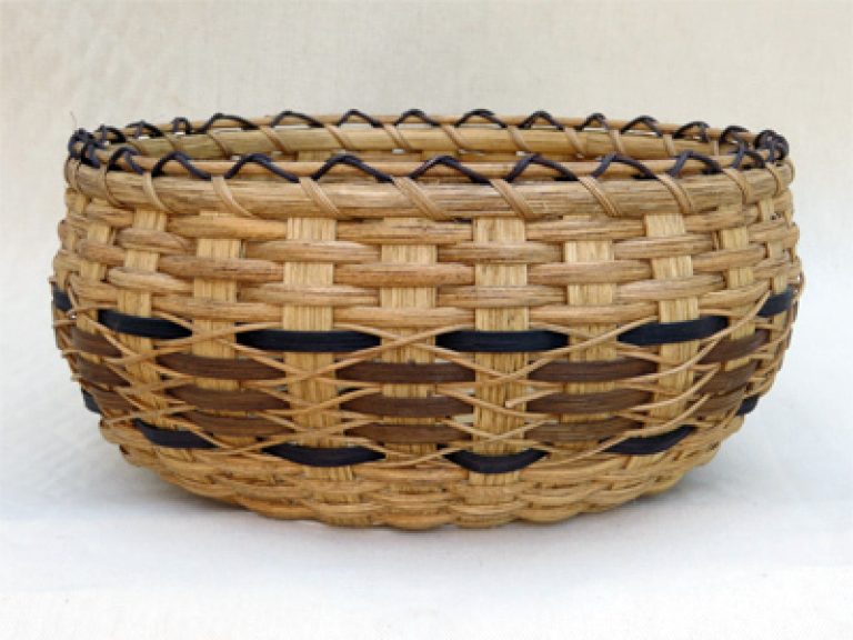 This beautiful snack basket has a round woven base using #2 round reed. Learn this cross stitch design on the sides along with this round reed rim filler with a colored laser to set off the beauty of the rim.