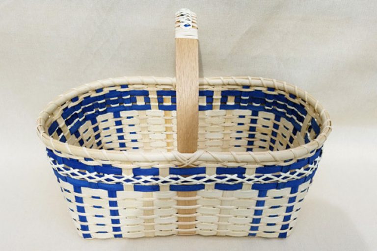 This striking basket features fancy lattice weaving in the center using bleached hamburg cane. It has a woven filled base using natural and colored spokes. The side weaving is all start/stop with a traditional rim. Also learn to wrap this decorative handle top.