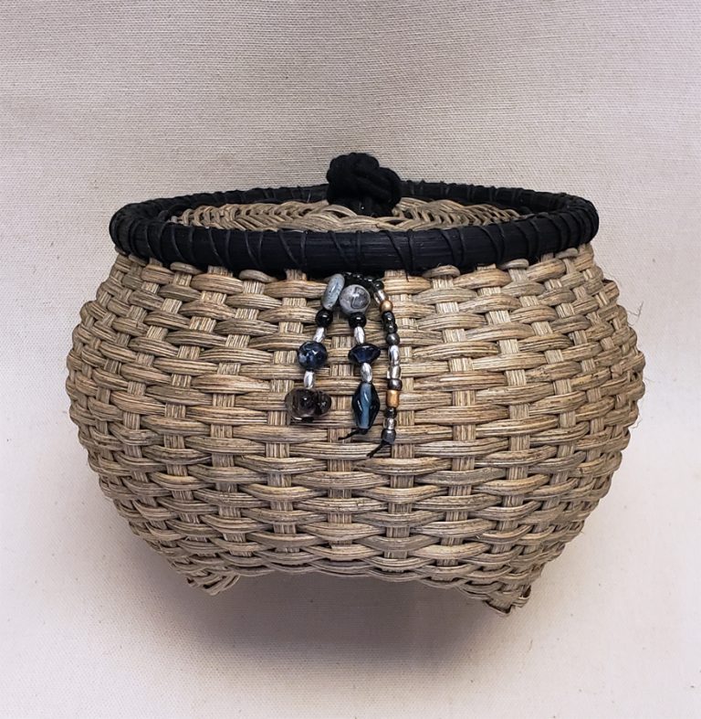 Learn techniques to achieve this adorable cathead shaped Bean Pot. You will learn lots of shaping tips and how to weave an inside lip to rest your woven lid. The body of the basket is traditional start/stop weaving ending with a black rim laced with waxed linen in a V technique. On the lid you will weave with all round reed using black spokes that trim the natural weaving with a black braided border. Black cording is used to weave the handle knot. Mine is stained with Driftwood but also beautiful left natural.
