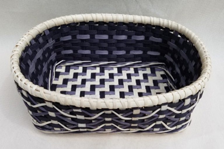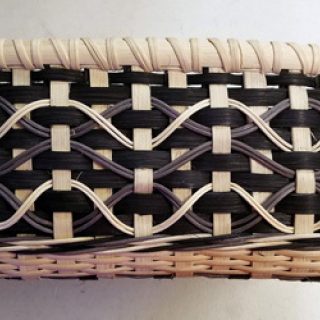This striking double walled basket begins with a black, gray and natural twilled base with swirled triple twining. Build up both walls and end with a traditional rim laced with a V design. Learn this rolling waves overlay pattern on the outside wall with round reed.